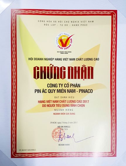 Tối ngày 2/3/2017, PINACO- nhà sản xuất Pin Con Ó và Ắc Quy Đồng Nai- cùng với 591 doanh nghiệp khác được vinh danh hàng Việt Nam Chất Lượng Cao và đặc biệt hơn, PINACO tự hào là một trong số ít các doanh nghiệp liên tục 21 năm liền đạt danh hiệu này.