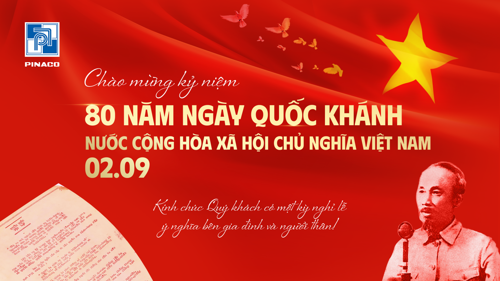 80 năm đã trôi qua, trang sử “Độc lập - Tự do - Hạnh phúc” vẫn khắc sâu trong từng trái tim của mỗi người Việt. Nhân kỷ niệm trọng đại, PINACO xin gửi lời tri ân sâu sắc đến các bậc cha anh đã ngã xuống vì hòa bình hôm nay. Tiếp nối truyền thống tự hào, PINACO sẽ luôn giữ vững tinh thần đổi mới, sáng tạo - không ngừng vươn xa, góp phần đưa Việt Nam ngày càng giàu đẹp, hùng cường.