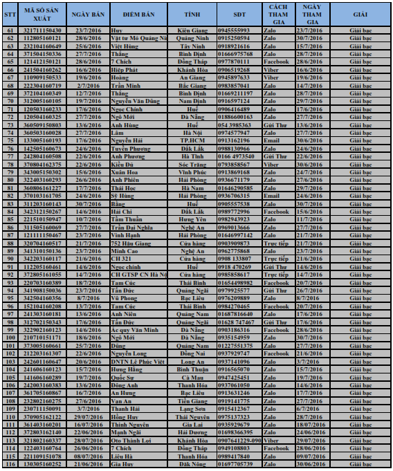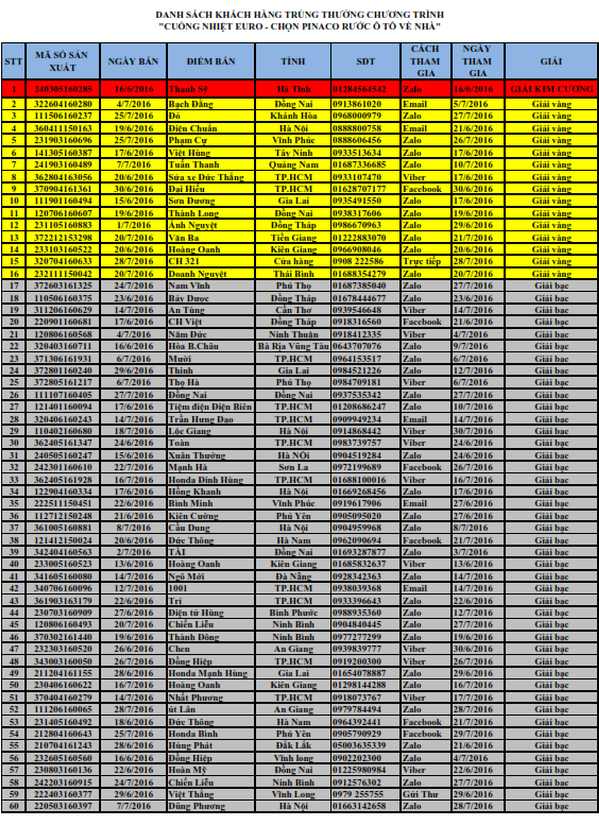 DANH SÁCH KHÁCH HÀNG TRÚNG THƯỞNG CHƯƠNG TRÌNH "CUỒNG NHIỆT EURO - CHỌN PINACO RƯỚC Ô TÔ VỀ NHÀ"
