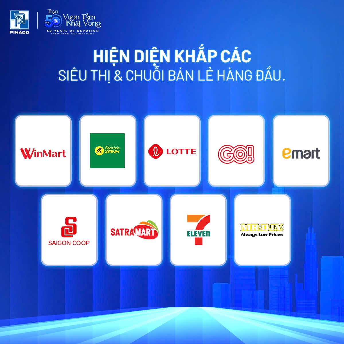 Các hệ thống siêu thị & chuỗi bán lẻ hàng đầu: WinMart, Bách Hóa Xanh, Lotte, GO!, Emart, Saigon Co.op, SATRA, 7-Eleven, MR. DIY.