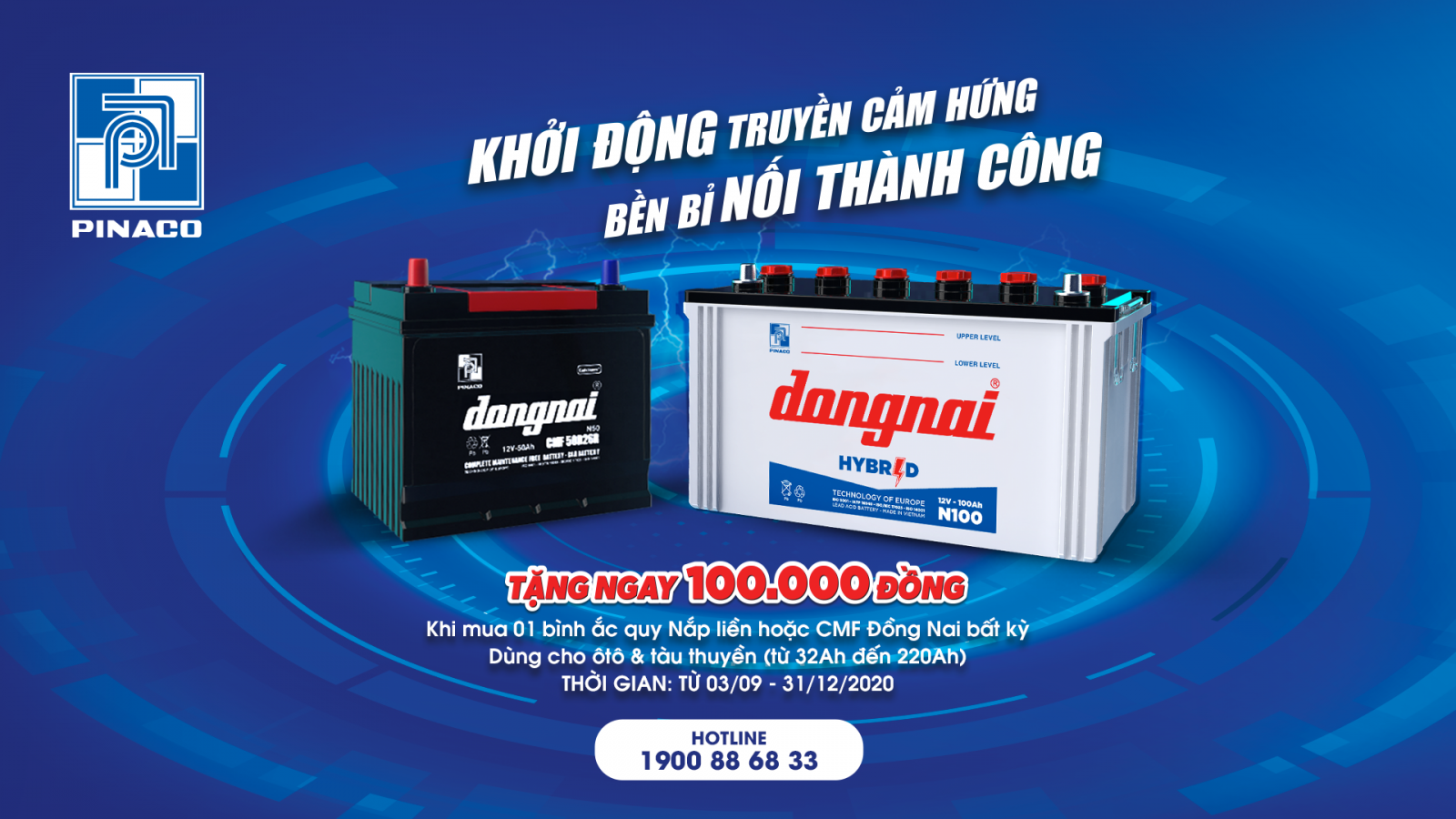 Nhằm chia sẻ và hỗ trợ khách hàng trong mùa dịch khó khăn, đồng thời tiếp nguồn năng lượng mạnh mẽ - bền bỉ - an toàn cho những hành trình “Tái khởi động” chinh phục những cung đường khắp mọi miền tổ quốc. Ắc quy Đồng Nai - PINACO tặng ngay 100.000 đồng khi mua ắc quy dùng cho xe ô tô hoặc tàu thuyền trong chương trình “Khởi Động Truyền Cảm Hứng, Bền Bỉ Nối Thành Công”.