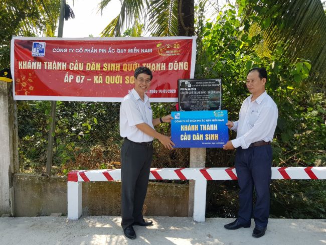 Ông Trần Thanh Văn – Tổng Giám đốc Công ty CP Pin Ắc quy Miền Nam và Ông Trần Minh Đức – Chủ tịch UBND Xã Qưới Sơn khánh thành Cầu dân sinh tại Ấp Qưới Thạnh Đông