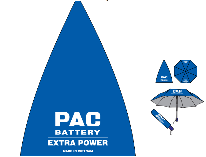 2- Dù cầm tay với số lượng từ 500 đến 2.000 cây (vải 2 da , màu xanh 100% không thấm nước,tự động 1 chiều, thân sắt xi, kèo xếp 3, tay cầm nhựa đen, in logo tại 2 vị trí) marquette như hình.